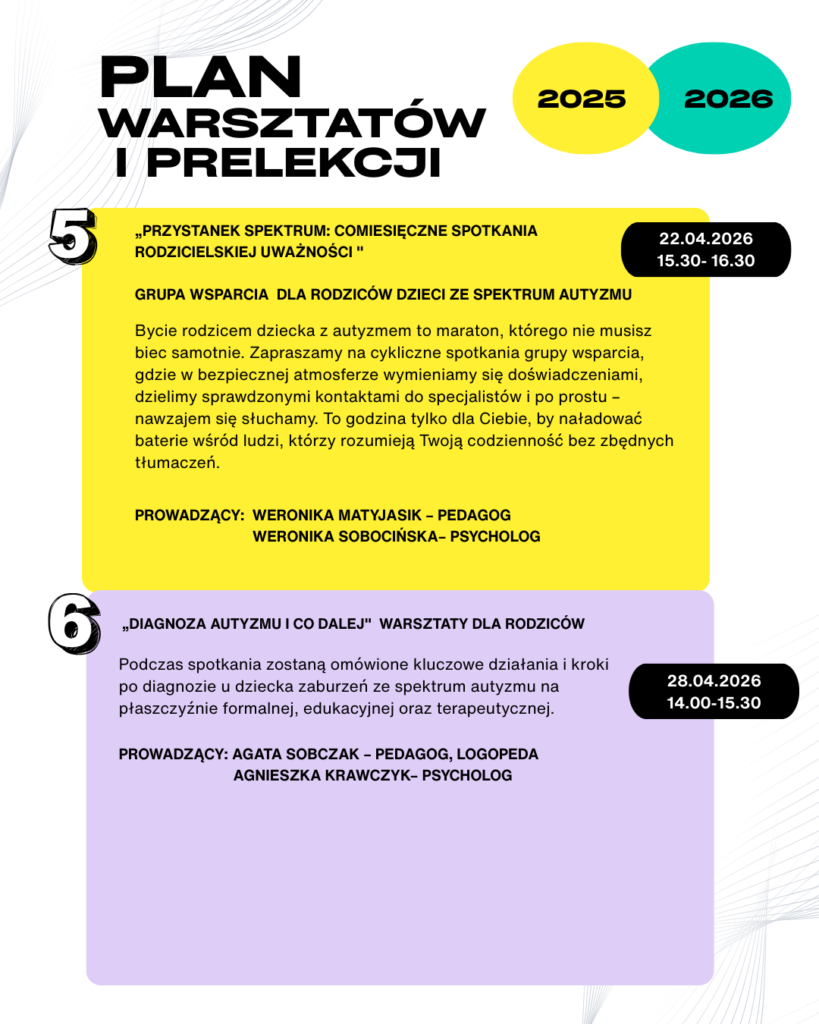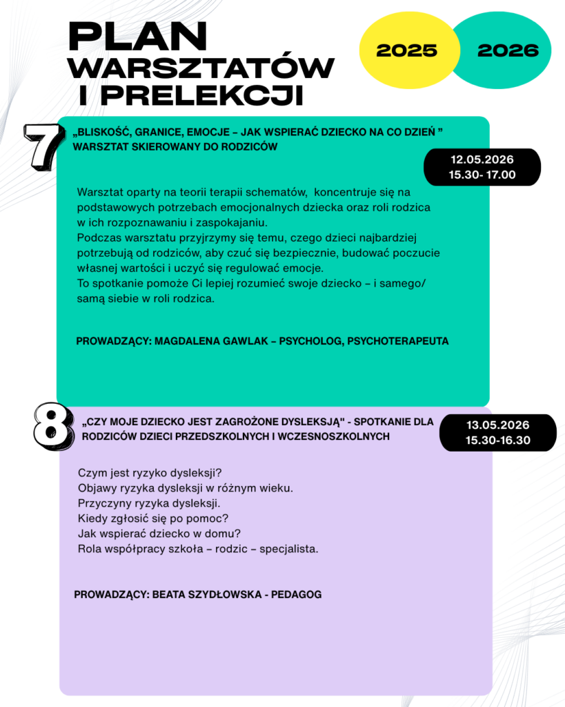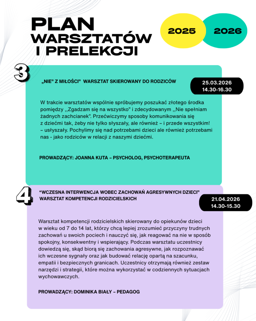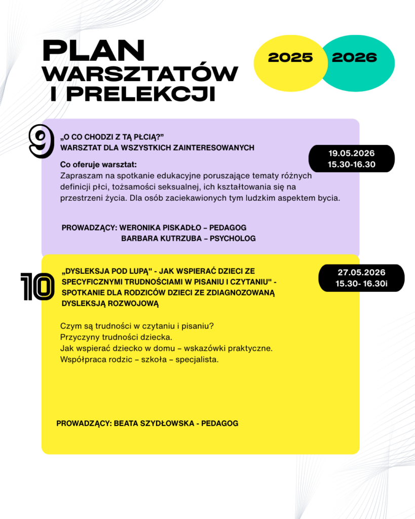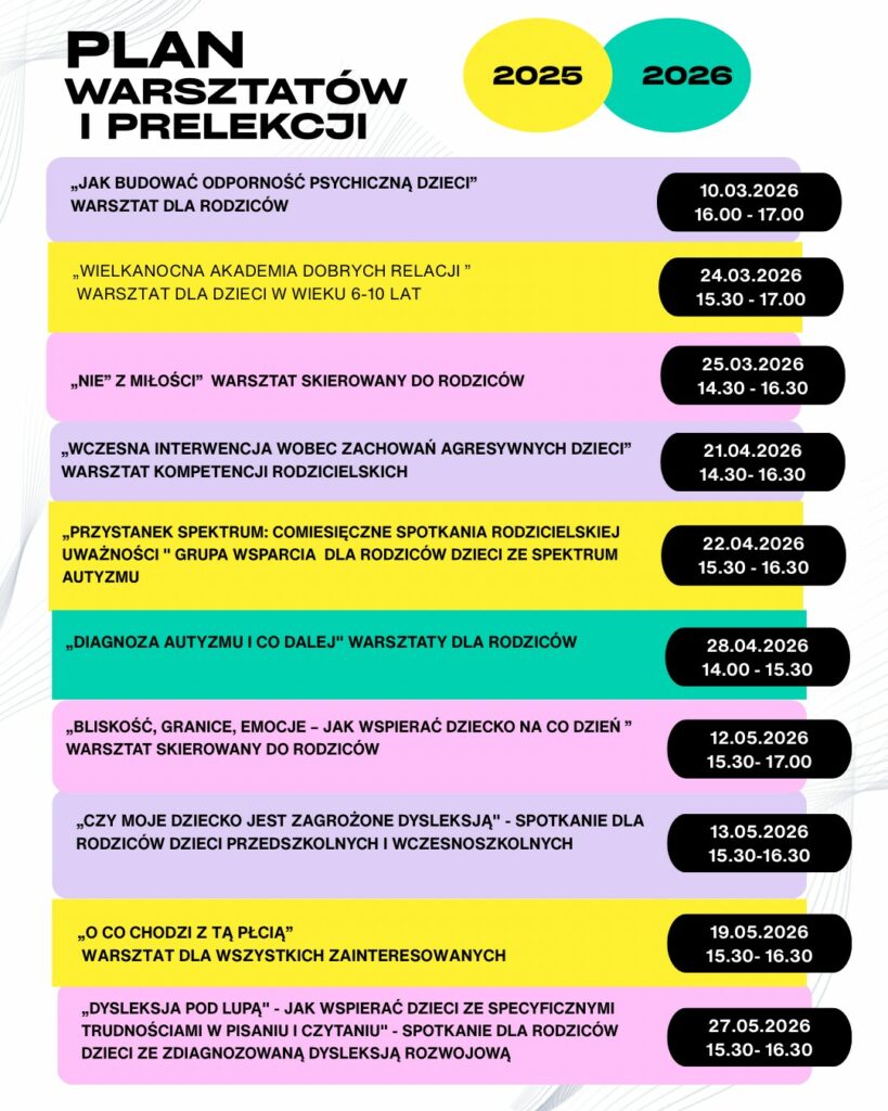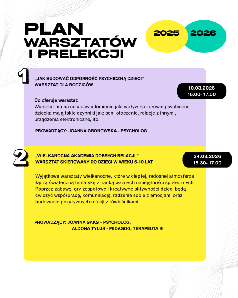 Serdecznie zapraszamy dzieci, rodziców oraz nauczycieli i inne osoby zainteresowana na kolejny cykl warsztatów. Wszystkie zajęcia odbędę się w siedzibie Poradni Psychologiczno-Pedagogicznej w Inowrocławiu. Ilość miejsc jest ograniczona. Prosimy o zapisy poprzez formularze rejestracyjne on-line.