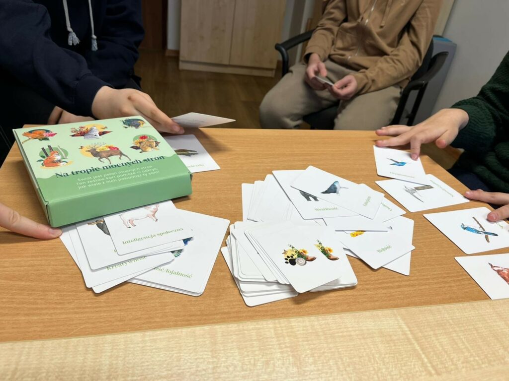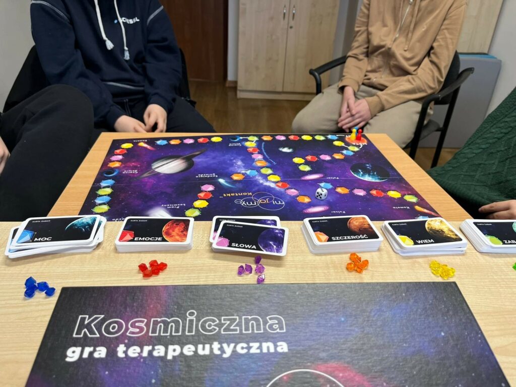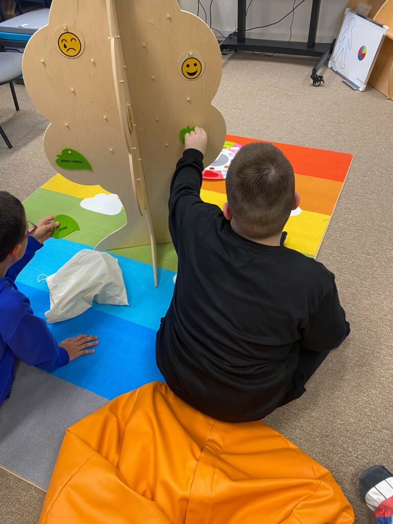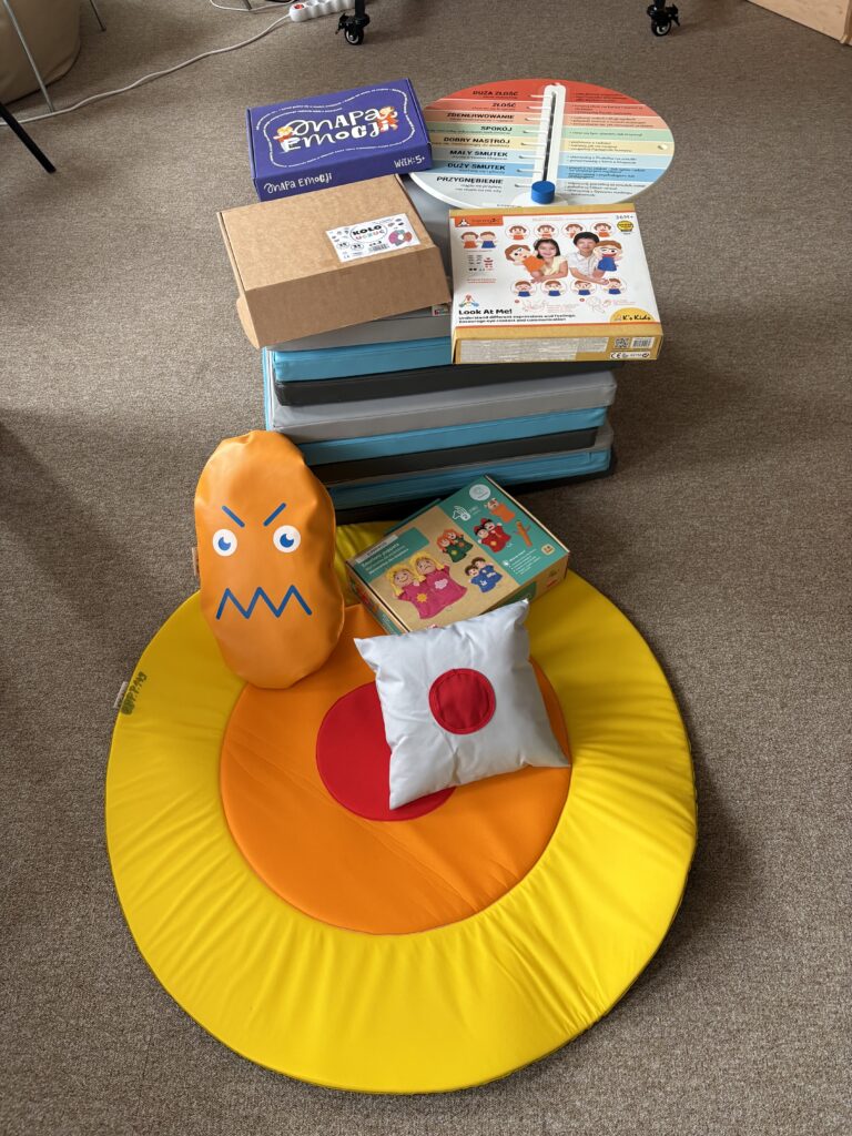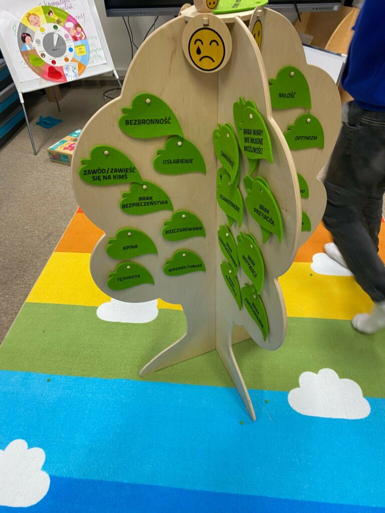– pomoce do wsparcia rozwoju emocjonalno-społecznego dzieci i młodzieży wykorzystywane podczas zajęć indywidulanych oraz grupowych np. treningu umiejętności społecznych – m.in. mapę emocji, pacynki – poznajemy emocje, drzewo smutku i radości, pakiet pomocy wspierających odreagowane emocji, koło uczuć.